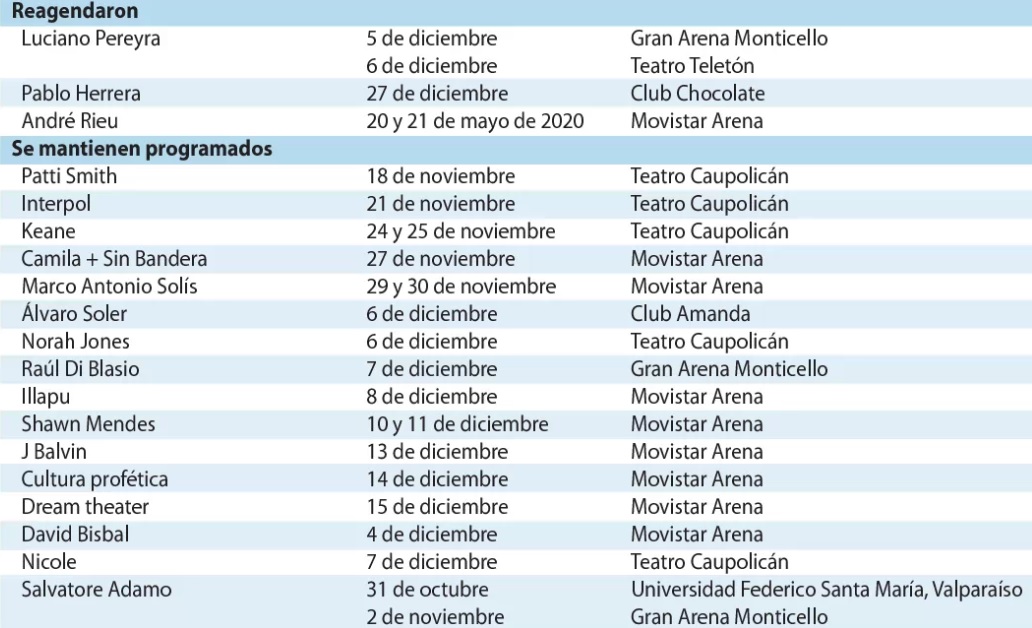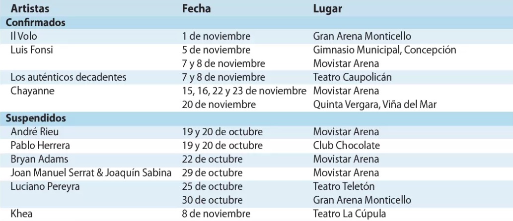 Debido a los cambios que se han registrado en la cartelera de grandes conciertos, el diario LUN.com realizó un calendario con los conciertos que sí se harán en las próximas semanas, así como de los que fueron cancelados y reagendados.