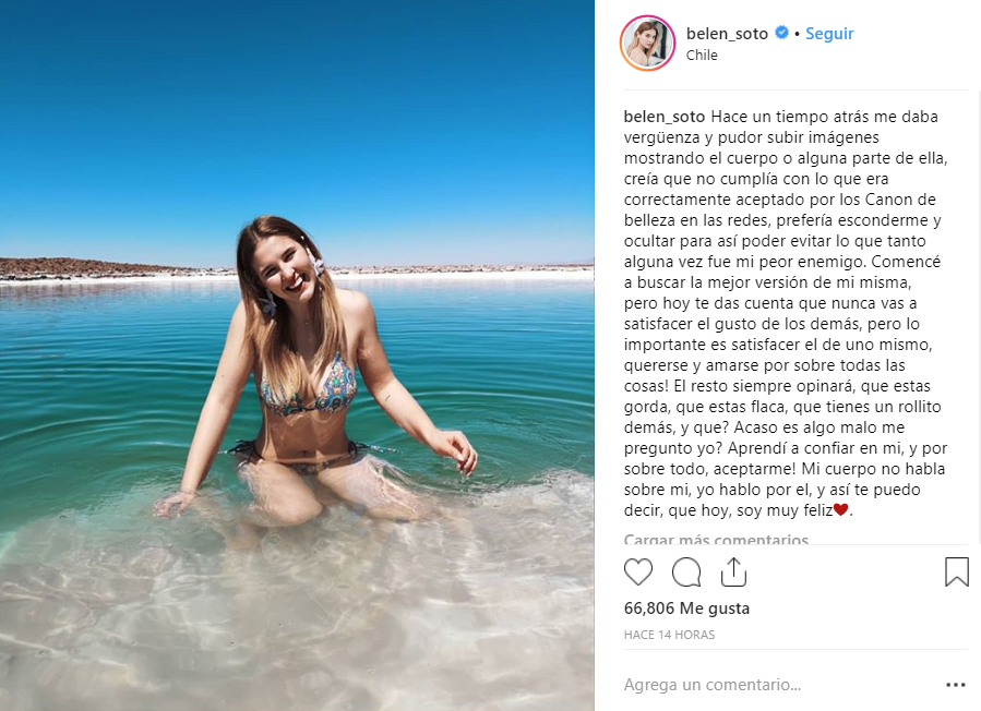"Hace un tiempo atrás me daba vergüenza y pudor subir imágenes mostrando el cuerpo o alguna parte de ella, creía que no cumplía con lo que era correctamente aceptado por los Canon de belleza en las redes, prefería esconderme y ocultar para así poder evitar lo que tanto alguna vez fue mi peor enemigo", comienza escribiendo.