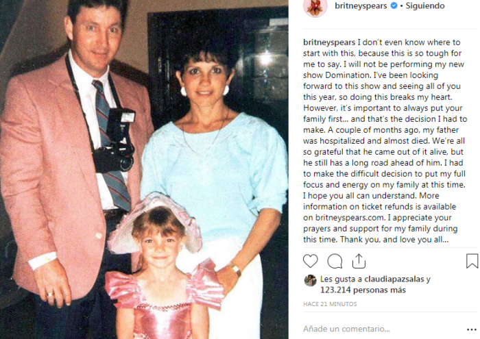 “Hace un par de meses, mi padre fue hospitalizado y casi muere. Todos estamos muy agradecidos de que haya salido con vida, pero todavía tiene un largo camino por delante”, explicó la intérprete de "One More Time".