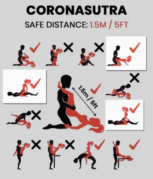 Por esta razón, en redes sociales se empezó a viralizar el Coronasutra, una guía con las posiciones sexuales del clásico Kamasutra pero adaptado a la contingencia para mantener la distancia social recomendada. Son siete posturas en las que se mantiene más de un metro y medio de distanciamiento entre las bocas de los practicantes, para evitar el contagio por gotitas que tanto se ha mencionado en la prensa.