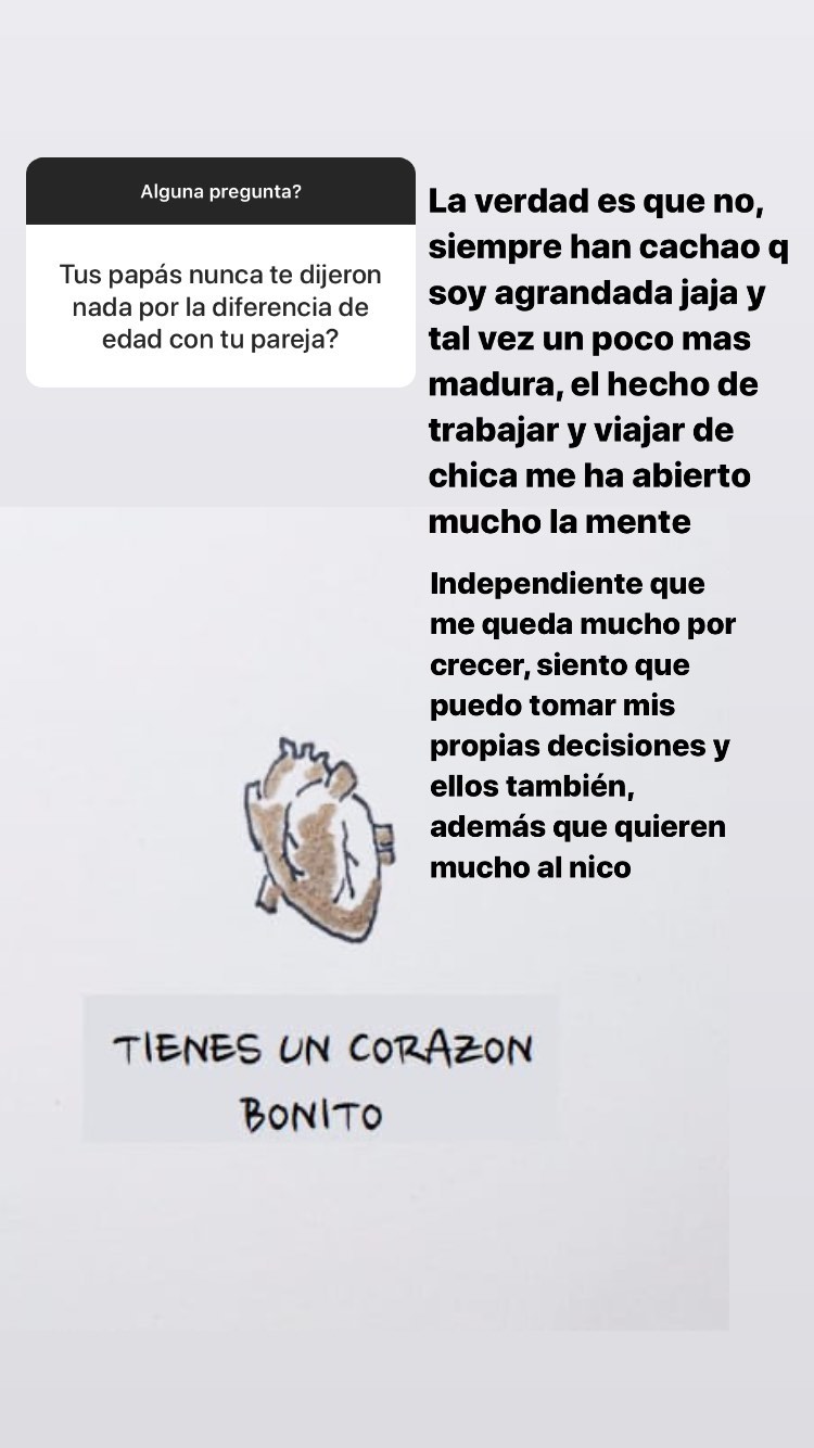 Ante la duda sobre la reacción de sus papás, explicó que "siempre han cachao que soy agrandada jaja y tal vez un poco más madura, el hecho de trabajar y viajar de chica me ha abierto mucho la mente".