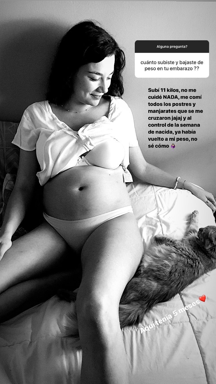 Y contó que subió 11 kilos en el embarazo, pero que no se arrepiente de nada. "No me cuidé nada, me comí todos los postres y manjarates que se me cruzaron jaja y al control de la semana de nacida, ya había vuelto a mi peso, no sé cómo".