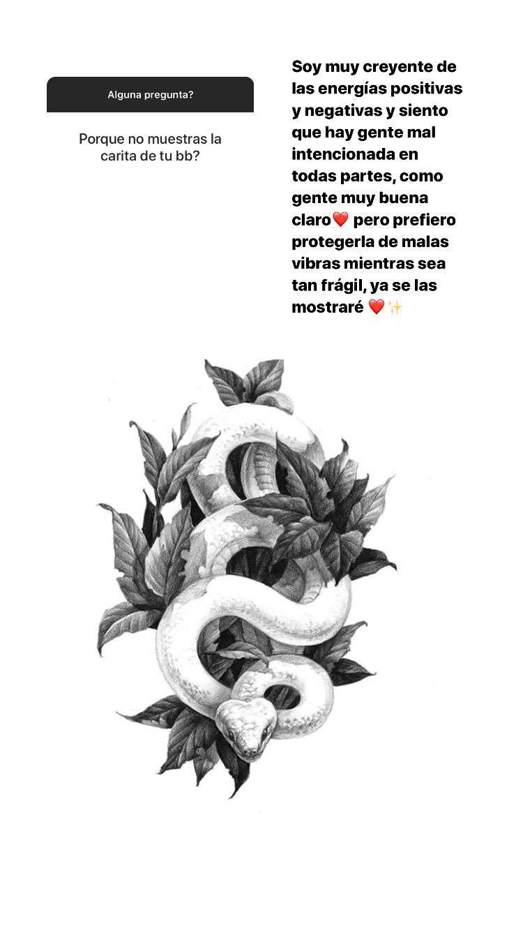 Hasta el momento no hemos visto el rostro de su hija, la razón se debe a que "hay gente muy mal intencionada en todas partes, como gente muy buena claro. Prefiero protegerla de malas vibras mientras sea tan frágil".
