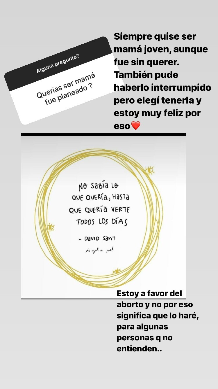 Sobre ser mamá joven reveló que siempre quiso serlo, "aunque fue sin querer. También pude haberlo interrumpido, pero elegí tenerla y estoy muy feliz con eso. Estoy a favor del aborto y no por eso significa que lo haré".
