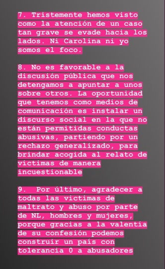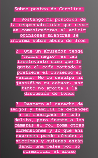 Carolina fue la primera en responder, acusando que "Denisse Malebrán señaló que yo había dicho que las acusaciones contra Nicolás López eran un problema de humor incomprendido, criticándome fuertemente por trivializar un tema así de grave", escribió en su cuenta de Instagram.