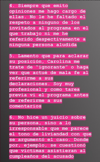"Sobre los descargos de Carolina de Moras refiriéndose a mi opinión en el último capítulo de #LlegotuhoraTVN, hice una reservada respuesta en mi cuenta de Instagram, pero dado que no ha cesado el ir y venir de juicios sin contexto, va mi respuesta en el siguiente hilo: