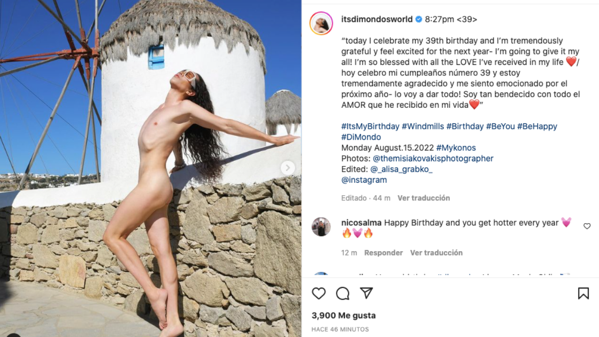 A través de su cuenta de Instagram @itsdimondosworld, Di Mondo publicó una imagen donde se le puede ver a cuerpo desnudo, posando en un típico paisaje de las islas griegas.
