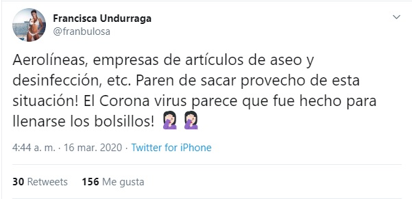 "Aerolíneas, empresas de artículos de aseo y desinfección, etc. Paren de sacar provecho de esta situación! El Corona virus parece que fue hecho para llenarse los bolsillos!", escribió Undurraga en la red social.