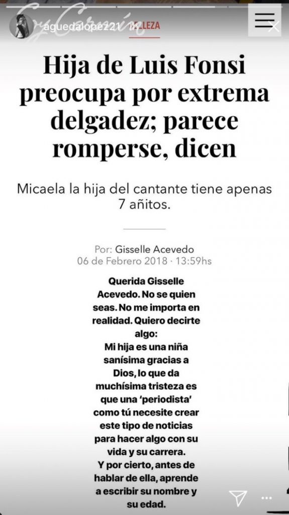 Tanto como Luis Fonsi como Águeda López no suelen compartir muchas fotos de sus hijos Mikaela y Rocco, de 6 y 1 año respectivamente. Sin embargo, la pareja ha publicado en su cuenta de Instagram, fotos de la pequeña Mikaela y que fueron compartidas por distintos medios. Entre ellos, un artículo del sitio web SoyCarmin.com escrito por Gisselle Acevedo y que se titulaba: "Hija de Luis Fonsi preocupa por extrema delgadez; parece romperse, dicen".