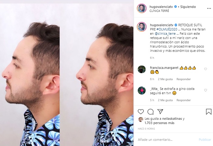 'Feliz con este retoque sutil a mi nariz con una rinomodelación con ácido hialurónico. Un procedimiento poco invasivo y más económico que otros', escribió Hugo en su cuenta de Instagram para evidenciar el antes y el después.