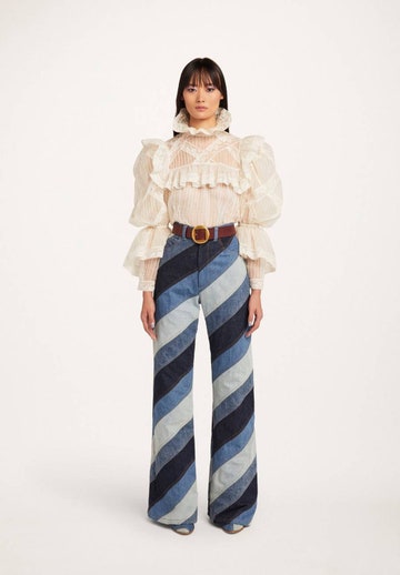 Como los jeans con parches ya ofrecen más textura y color, una buena idea para combinarlos es una blusa que vaya en contraste con los tonos de denim de tus pantalones. Puedes usar unos jeans de tiro alto, con parches de distintas texturas de jeans, con una blusa de estilo romántico, que le daría un toque setentero. También puedes usarlos con un top de un tono más bien neutro.