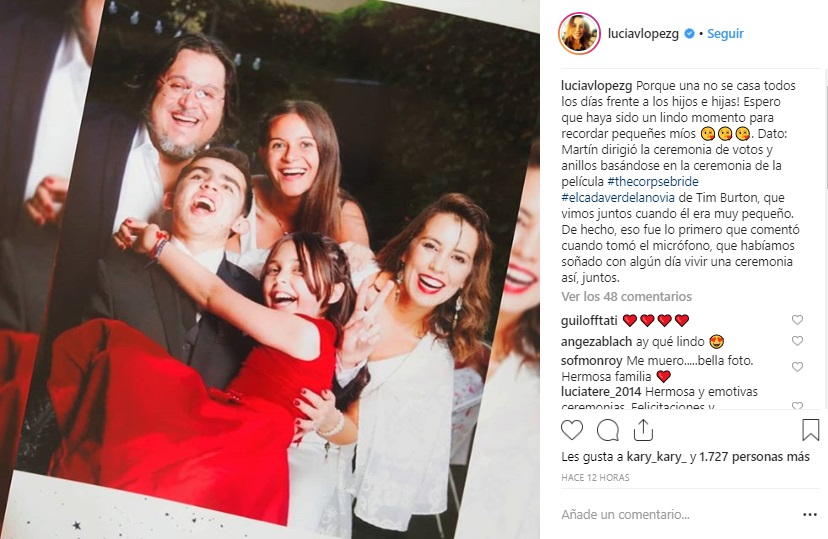 "Porque una no se casa todos los días frente a los hijos e hijas! Espero que haya sido un lindo momento para recordar pequeñes míos. Dato: Martín dirigió la ceremonia de votos y anillos basándose en la ceremonia de la película #thecorpsebride #elcadaverdelanovia de Tim Burton, que vimos juntos cuando él era muy pequeño. De hecho, eso fue lo primero que comentó cuando tomó el micrófono, que habíamos soñado con algún día vivir una ceremonia así, juntos", escribió la conductora de radio y TV.