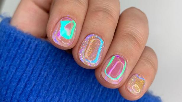 Esta manicura resulta especialmente fascinante gracias a su acabado reluciente y tornasoleado, cuyos matices cambian con el movimiento de los dedos y crean un efecto futurista.