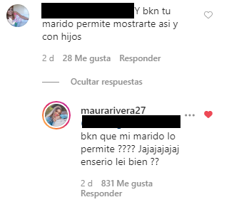 "¿Bkn que mi marido lo permite? ¿En serio leí bien?", respondió Maura, desconcertada por el comentario. Varias de sus seguidoras la respaldaron asegurando que la mujer no es propiedad del hombre y preguntando a la usuaria en cuestión en qué siglo vivía.