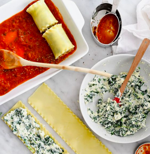 3- Cuando escurras las espinacas, aliñarlas con sal, pimienta, y agregar el queso ricotta a gusto, el huevo, y dos cucharadas de queso parmesao. Escurrir también las lasañas, y estirarlas. Agregar la mezcla de espinaca con ricotta sobre la lámina, y enrollar con la "costura" hacia abajo para que no se abran.