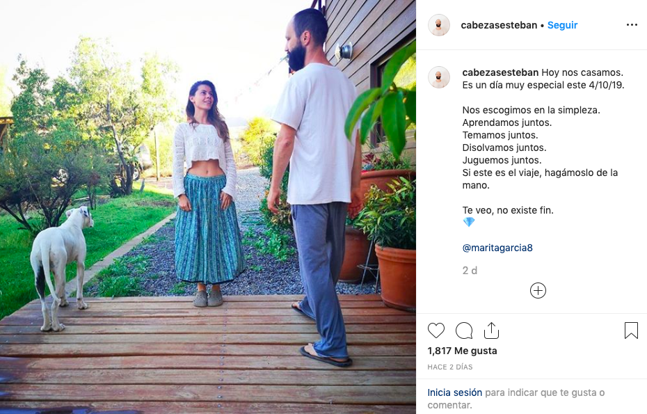 “Hoy nos casamos. Es un día muy especial este 4/10/19. Nos escogimos en la simpleza. Aprendamos juntos. Temamos juntos. Disolvamos juntos. Juguemos juntos. Si este es el viaje, hagámoslo de la mano. Te veo, no existe fin”, escribió Esteban.