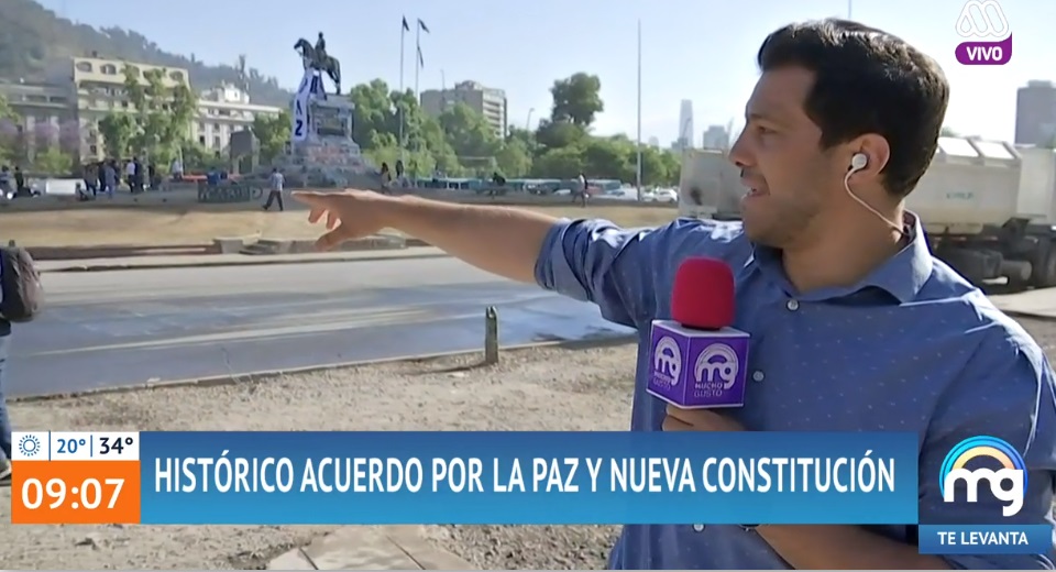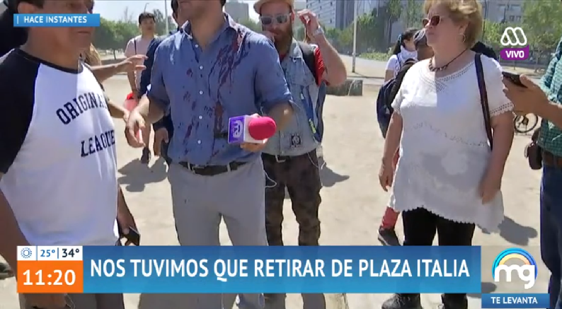 Una compleja situación vivió este viernes el reportero estrella de "Mucho gusto", Simón Oliveros, cuando realizaba un despacho desde Plaza Italia, donde conversó con transeúntes sobre el anuncio del acuerdo del Congreso por una nueva constitución.