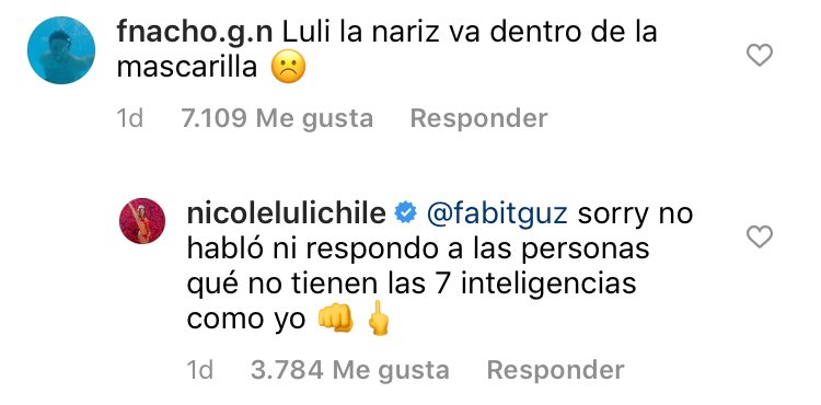 Por lo mismo, uno de sus seguidores se lo hizo notar con el siguiente comentario: 'Luli la nariz va dentro de la mascarilla'.