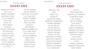 En el Instagram oficial recientemente se reveló un listados con los posibles participantes de este gran evento de moda, allí se detalla: "Aunque la lista oficial de invitados nunca será revelada en su totalidad, el museo ha anunciado quién será copresidente de la gala de este año. Lo que significa que definitivamente podemos esperar ver a Dua Lipa, Michael Coel, Penélope Cruz y Roger Federer subiendo esas famosas escaleras".