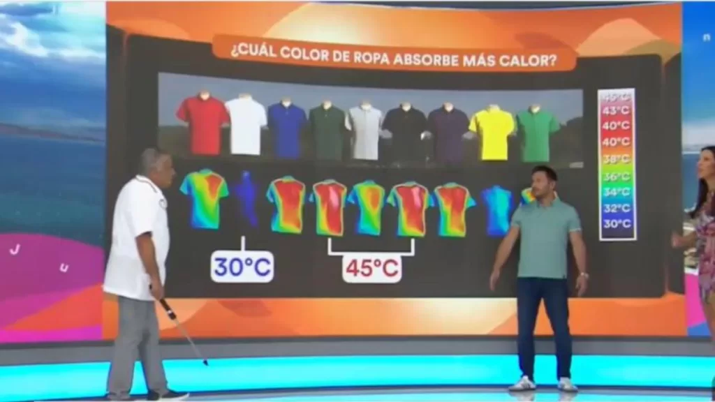 "Si ustedes ven una polera fresca azul, verde, gris, negra, uno dice 'bonita para salir en verano', pero miren lo que ocurre con la temperatura que se alcanza con esta polera bajo el sol: 45°C”, explicó mostrando un gráfico que deja en evidencia que mientras más oscura la ropa, más calor se siente.