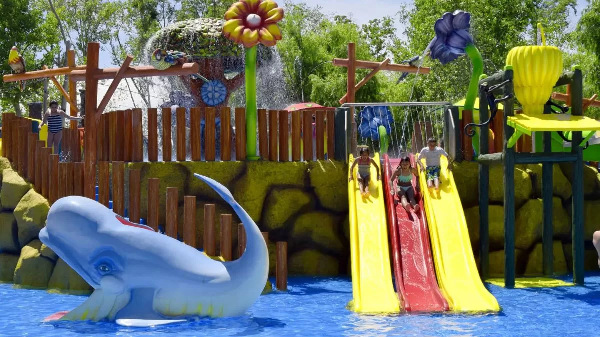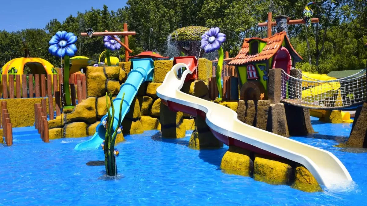 - Piscina Aldea Encantada para niños (Puente colgante, ocho toboganes, enormes flores y animales de plástico)
