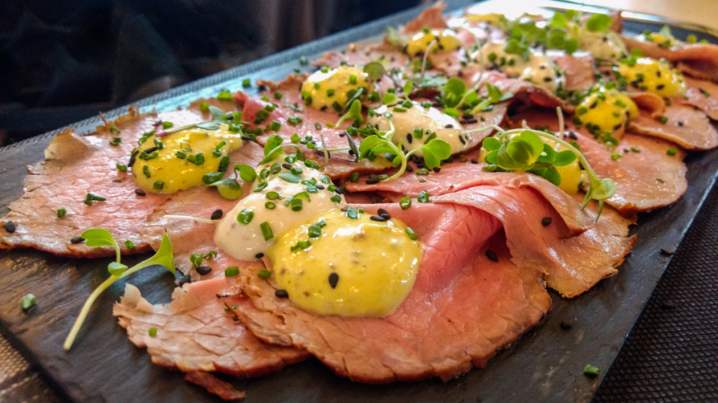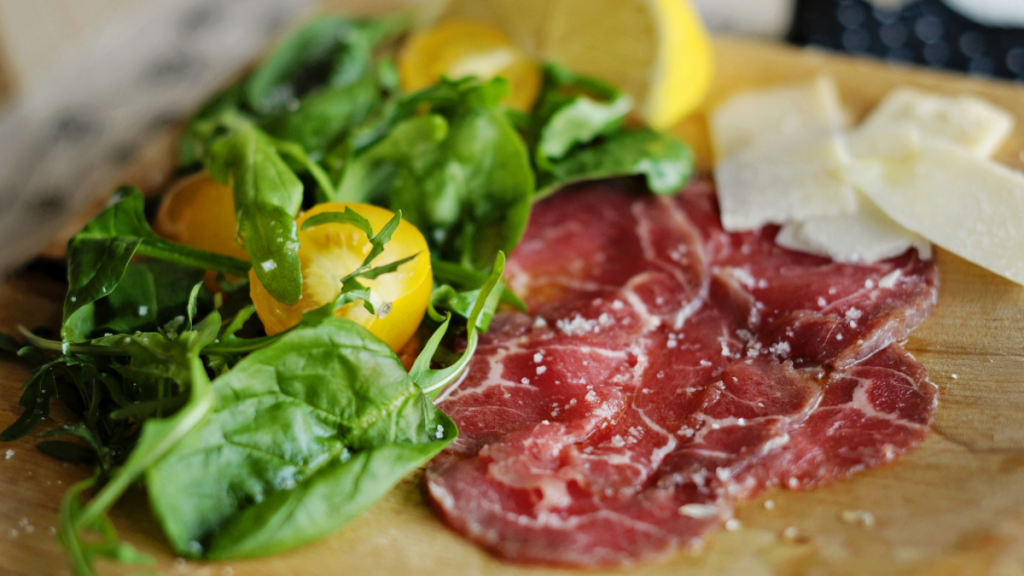El carpaccio es un plato típico de la cocina italiana y suele servirse como aperitivo. Su preparación es a base de laminas de carne cruda aliñada con aceite de oliva, sal, pimienta y zumo de limón. A la fecha su elaboración se ha diversificado haciendo posible que se incorporen otros ingredientes como verduras, semillas y frutos secos. Habitualmente las carnes más utilizadas en este plato es la de ternera, atún y salmón. Sin embargo, hoy se ha incorporado el zapallo italiano, champiñones y el tomate.