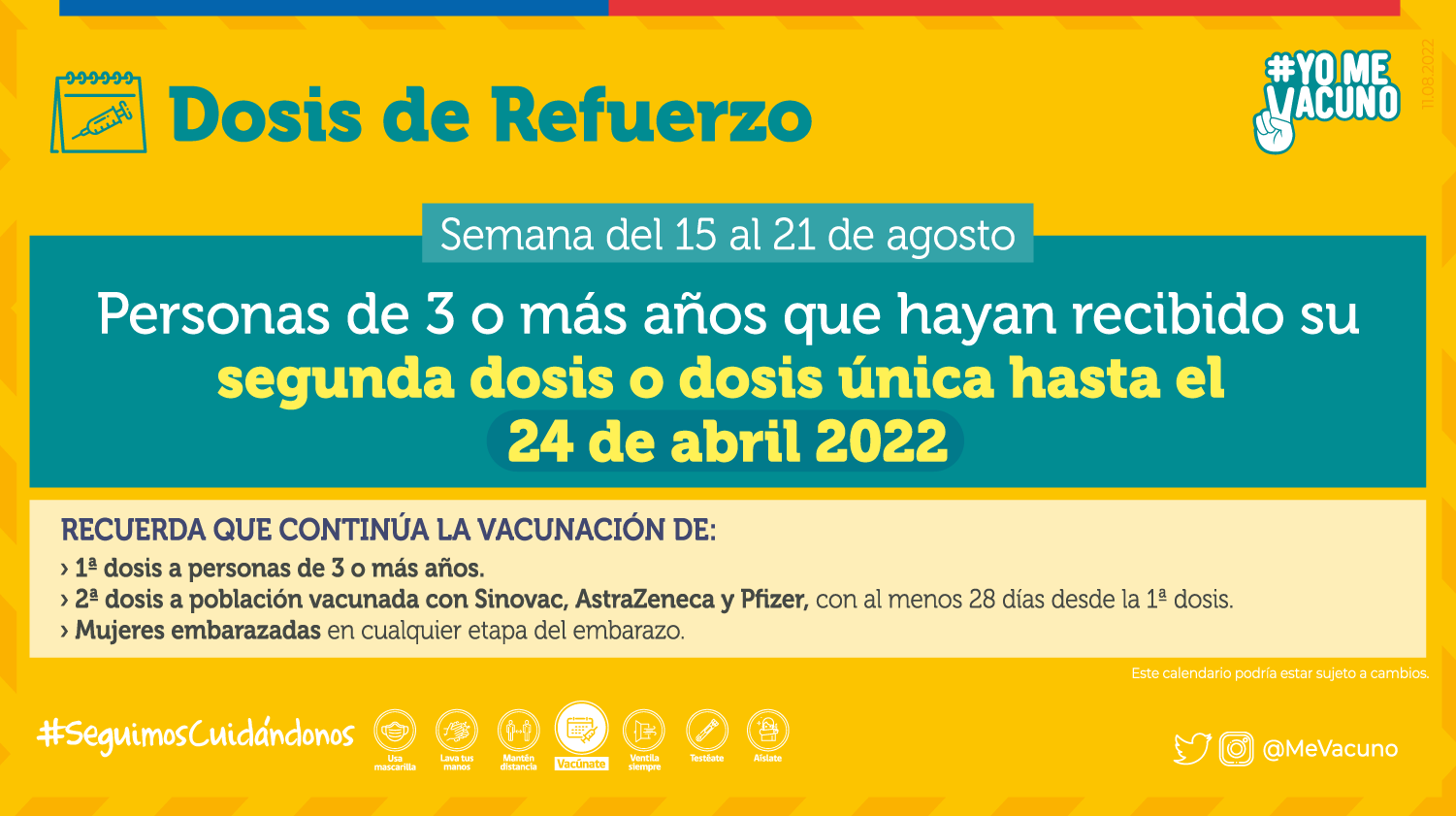 Comenzamos con el calendario de la dosis de refuerzo. Donde esta semana les corresponde recibirla a las personas de 3 años o más que hayan completado su proceso de vacunación (dosis única o dos dosis) hasta el pasado 24 de abril del 2022.