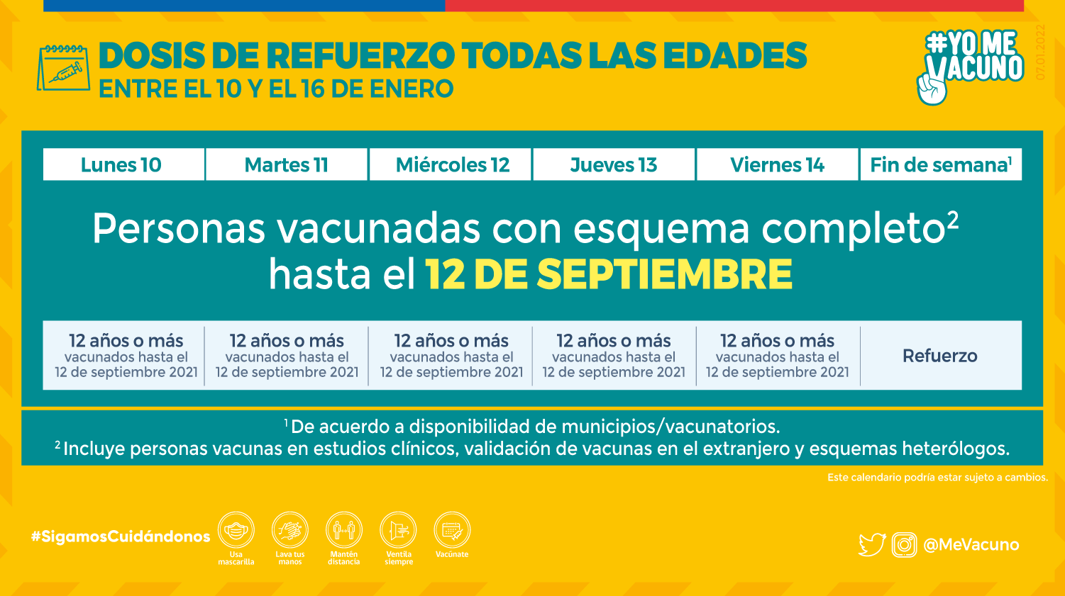 Siguiendo con los calendarios, llegamos al de la dosis de refuerzo (o también llamada tercera dosis). En esta ocasión les corresponde recibir esta vacuna a todas las personas que hayan completado su esquema de vacunación el pasado 12 de septiembre del 2021.