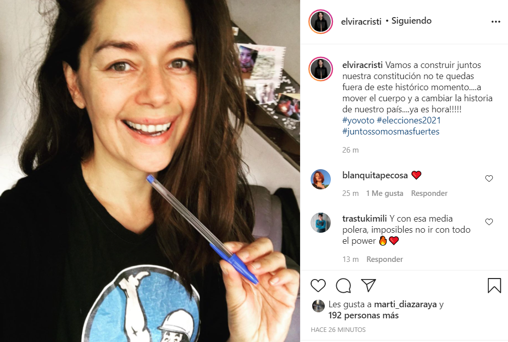 "Vamos a construir juntos nuestra constitución no te quedas fuera de este histórico momento....a mover el cuerpo y a cambiar la historia de nuestro país....ya es hora!!!!! #yovoto #elecciones2021 #juntossomosmasfuertes", escribió en su cuenta de Instagram.