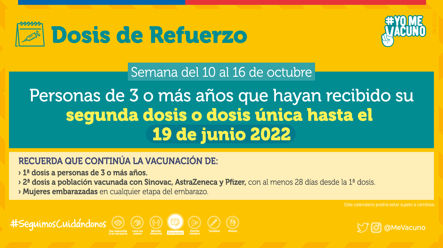 Por otra parte, entre la semana del 10 al 16 de octubre les corresponde Dosis de Refuerzo a las personas de 3 o más años, que hayan recibido su Segunda Dosis o Dosis Única hasta el 19 de junio del 2022.