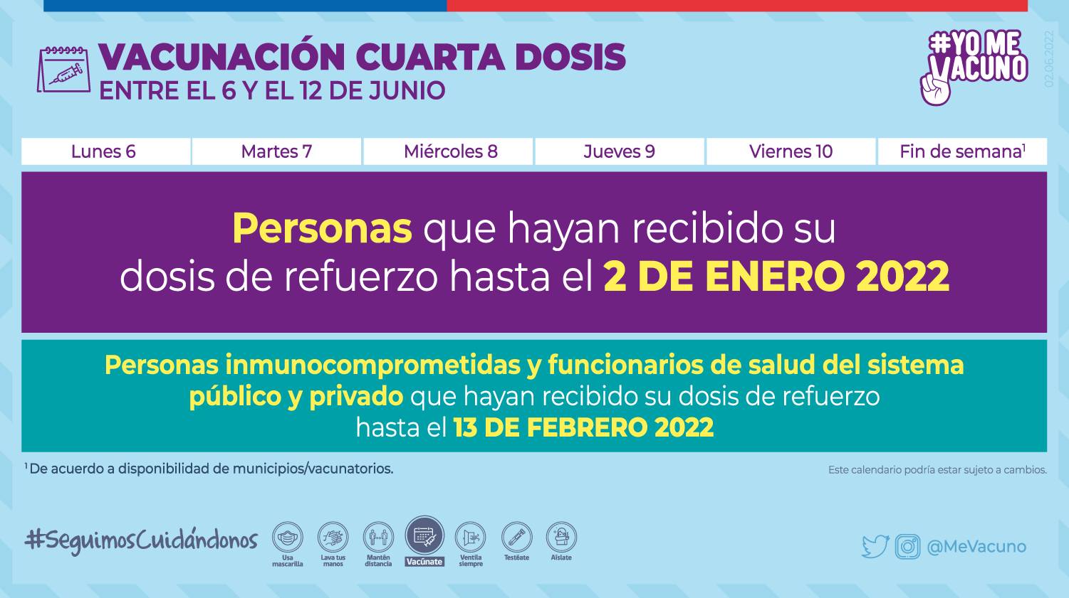 Y asimismo se vacunará con Cuarta Dosis a personas inmunocomprometidas y funcionarios de salud, del sistema público y privado. Todo ellos, que hayan recibido sus Dosis de Refuerzo hasta el 13 de febrero del 2022.