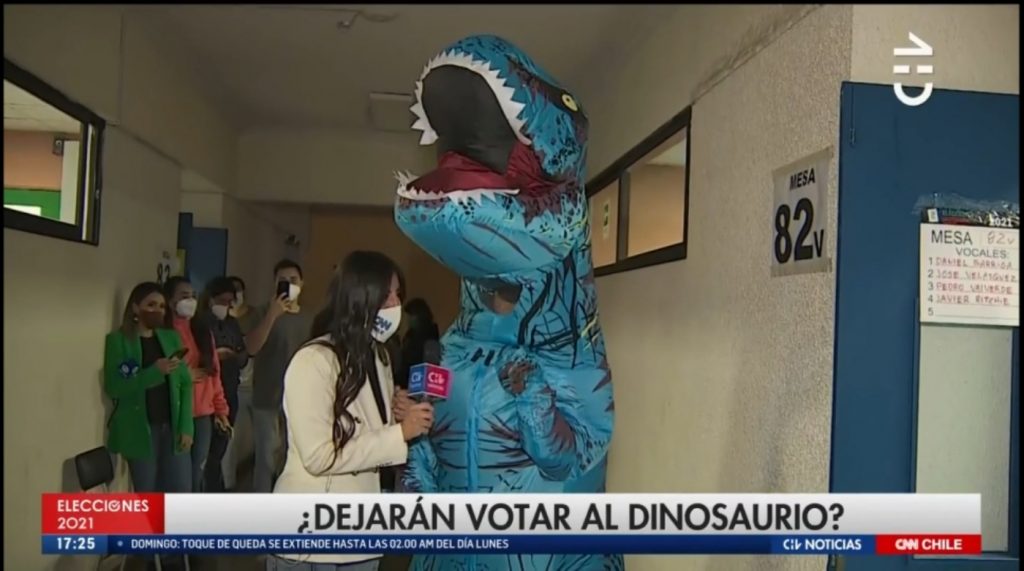 Desde CHV acompañaron al dinosaurio a que votara, quien debió sacarse su traje y mostrar su rostro, para poder realizar todo el proceso de forma legal y comprobar su identidad. Luego, fue hasta las urnas donde como contó en su relato, debió sacar su rostro para poder ver bien las papeletas.