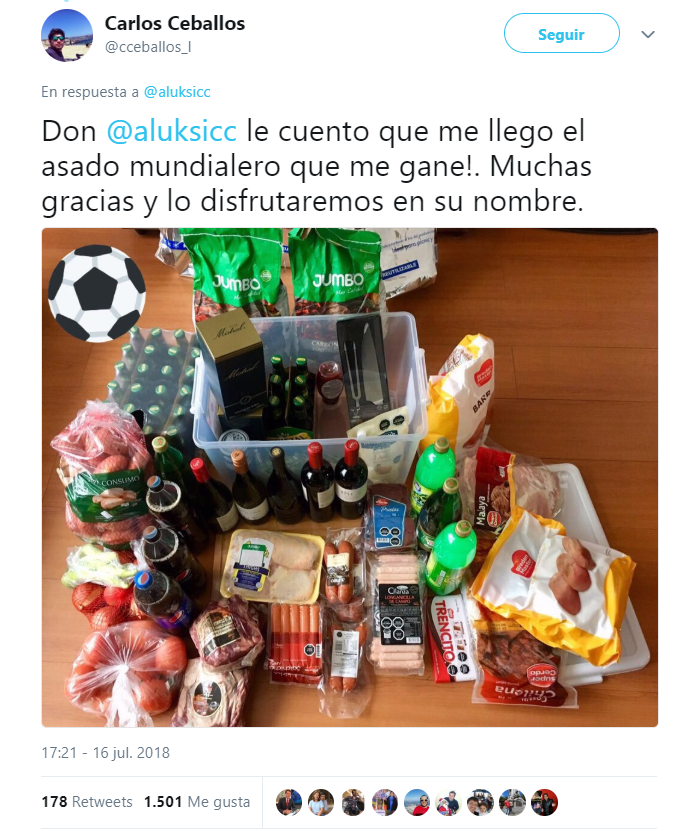 "Y luego de un intenso mes de fútbol, ya tenemos el cómputo de los ganadores del Gran Asado. Fueron 152 los visionarios que apostaron por el podio: 1. Francia, 2. Croacia, 3. Bélgica. Felicidades y atentos a sus Twitter que ya los están contactando. A disfrutar del asado en familia", escribió Luksic en su red social.