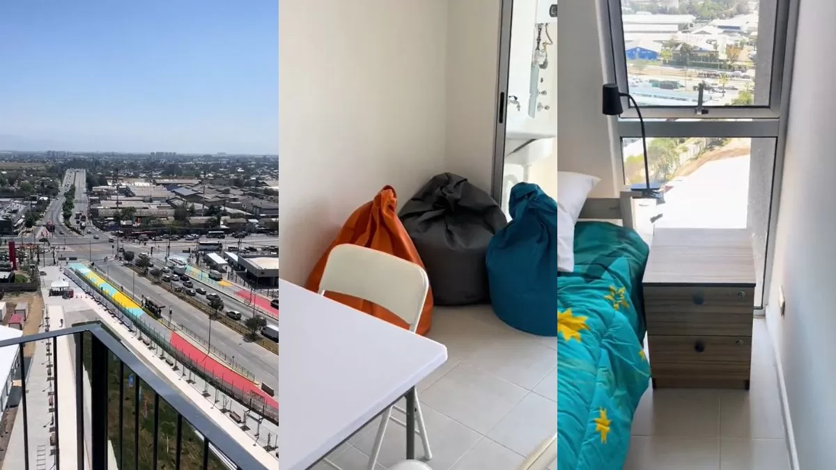 Antes de estos muestra el baño compartido, añadiendo, en sus palabras, que son bastante diminutos. Luego, menciona: “Uno de los cuartos, que es bastante pequeño. Caben dos camas, muy apegaditos”. Sin embargo, luego agrega: “Es bonita la vista”.