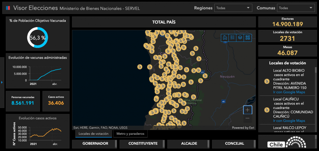 Tal como explicó el ministro de Bienes Nacionales, Julio Isamit, "Nuestro nuevo Visor de elecciones, muestra: georreferenciación de todos los locales de votación para que cada persona sepa cómo llega. Ubicaciones de las estaciones de metro y buses para saber cómo llegar en transporte público al local. Filtro por región y comuna para conocer las papeletas que te entregarán ese día, y así estés preparado y sea más rápida la votación".