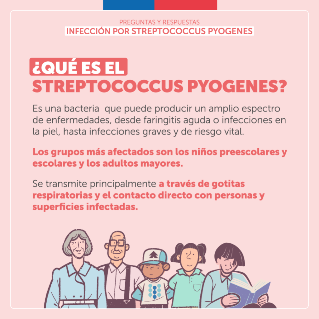 Asimismo, según información publicada por el Minsal, el Streptococcus Pyogenes es una bacteria que puede producir un amplio espectro de enfermedades, desde faringitis aguda o infecciones en la piel hasta infecciones graves de riesgo vital.