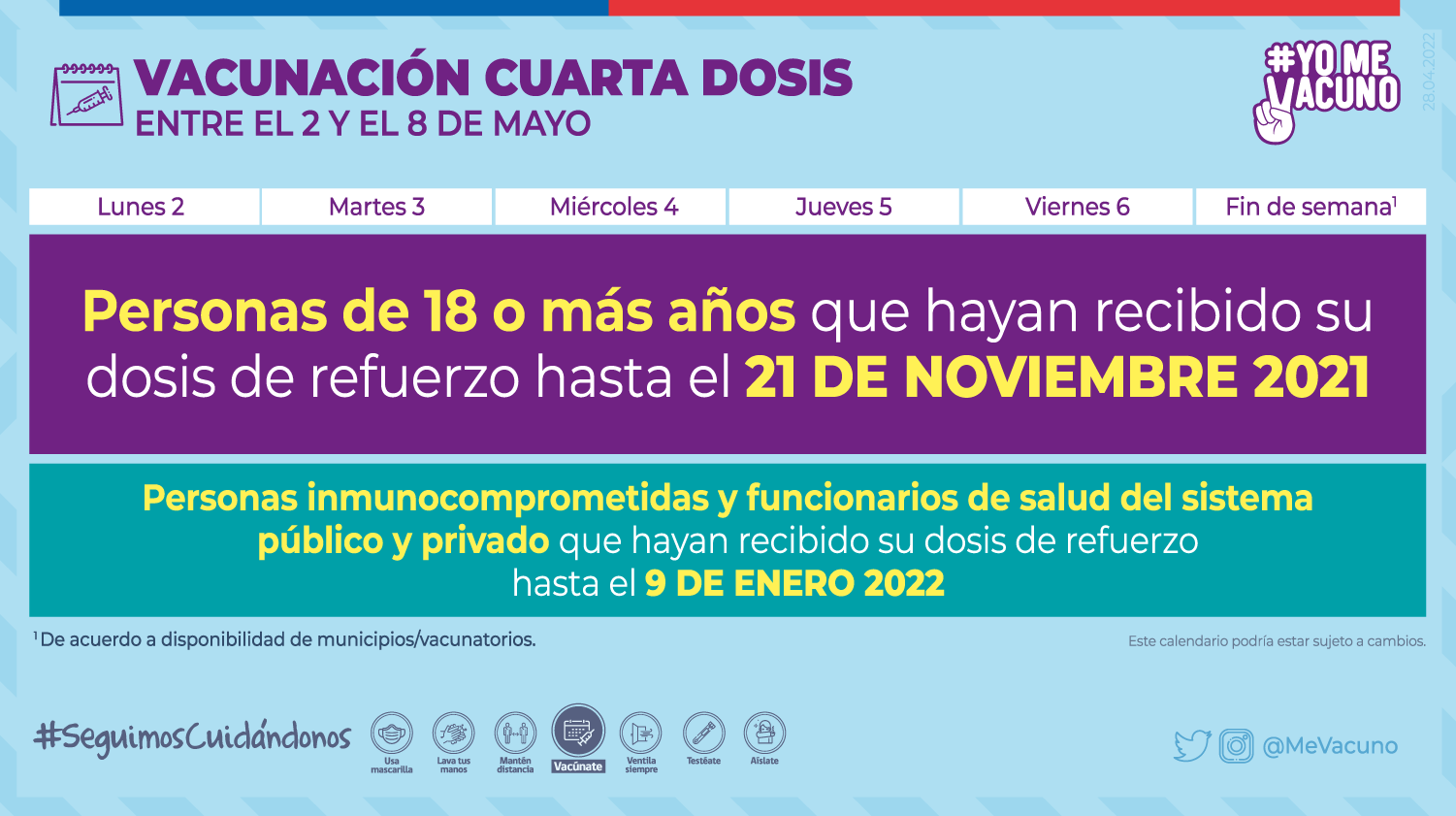 Como todos los lunes, en FMDOS, queremos compartir contigo los nuevos calendarios de vacunación contra el Covid-19, que el Ministerio de Salud (Minsal) tiene vigentes, los cuales son la cuarta dosis y dosis de refuerzo.