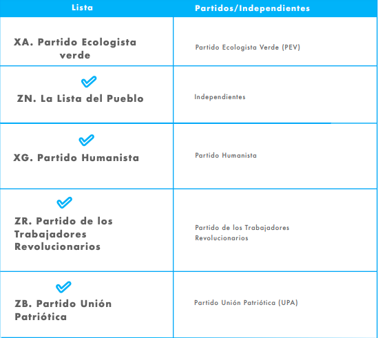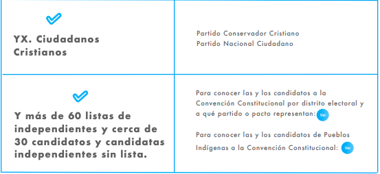 Aquí tenemos dos opciones: Constituyentes de partidos políticos e independientes. Al votar por una persona en específico, tal como informa la organización "Ahora Nos Toca Participar", también apoyas a la lista completa por la que está inscrito.