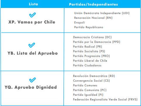 En estas listas puedes encontrar partidos junto a independientes, porque han cedido cupos, como también listas completas de independientes. Algunas de estas son: