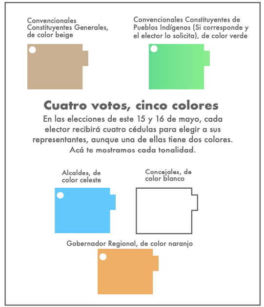 En esta oportunidad, las elecciones contarán con cuatro papeletas de cinco colores diferentes. La de Alcaldes será celeste, los concejales en blanco, los Gobernadores Regionales en naranjo y los Constituyentes generales en beige y de pueblos indígenas en verde.