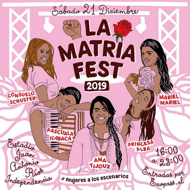 Ana Tijoux, Princesa Alba, Pascuala Ilabaca, Consuelo Schuster y la directora de La Matria Producciones, Mariel Mariel, serán las protagonistas de esta nueva edición. El evento se realizará en el Estadio Juan Antonio Ríos, en la comuna de Independencia, y las entradas ya se encuentra a la venta a través de EcoPass. El precio de pre-venta es de $6 mil pesos.
