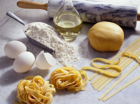 - En un bol, pon harina, semolina, aceite de oliva, agua y huevos. Amasa con las manos enérgicamente, hasta tener una masa firme.