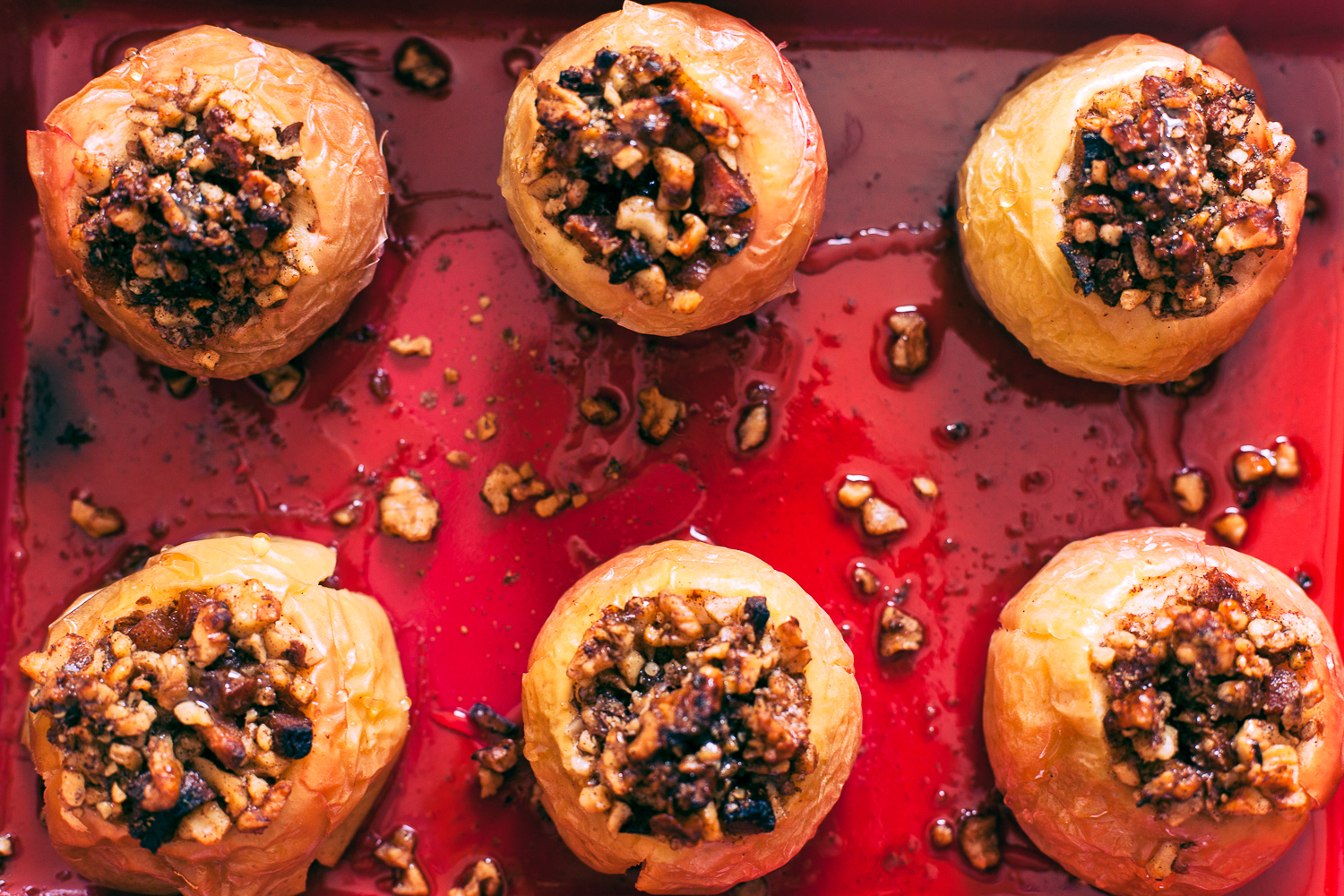En cada manzana sobre el relleno deja 1 cucharadita o un cubo de mantequilla fría. Hornea a 180° o fuego medio alto por 40-50 minutos. Cuando los jugos burbujeen y nos embriague su dulce olor, estarán a punto para disfrutar. La mantequilla se va a derretir bañando los frutos secos, un dulzor natural, textura suave y deliciosa. Quedará increíble, se van a acordar de mí.