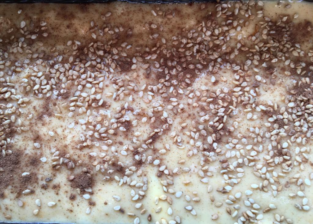 En un bowl ponemos la harina cernida, y añadimos la mezcla y revolvemos bien. Después, ponemos aceite a un molde de queque y le echamos la mezcla. Elvira le puso arriba sésamo tostado y un poco de canela.
