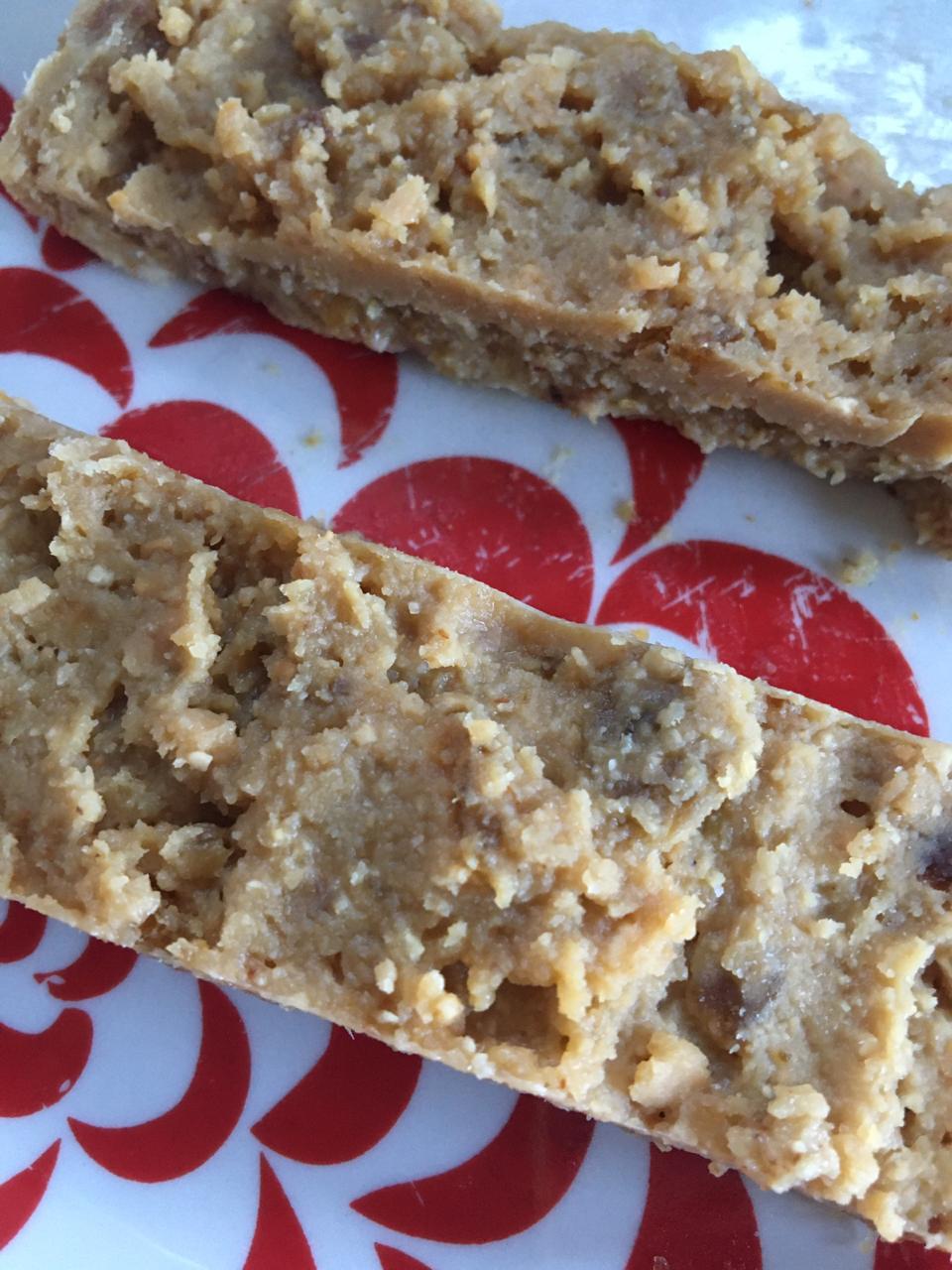 Para la segunda capa de los snickers veganos, procesamos ½ taza de mantequilla de maní (se puede hacer en la minipimer), agregamos 1 cucharada de aceite de coco, y 1 taza y media de pasas o dátiles. Trituramos todo.