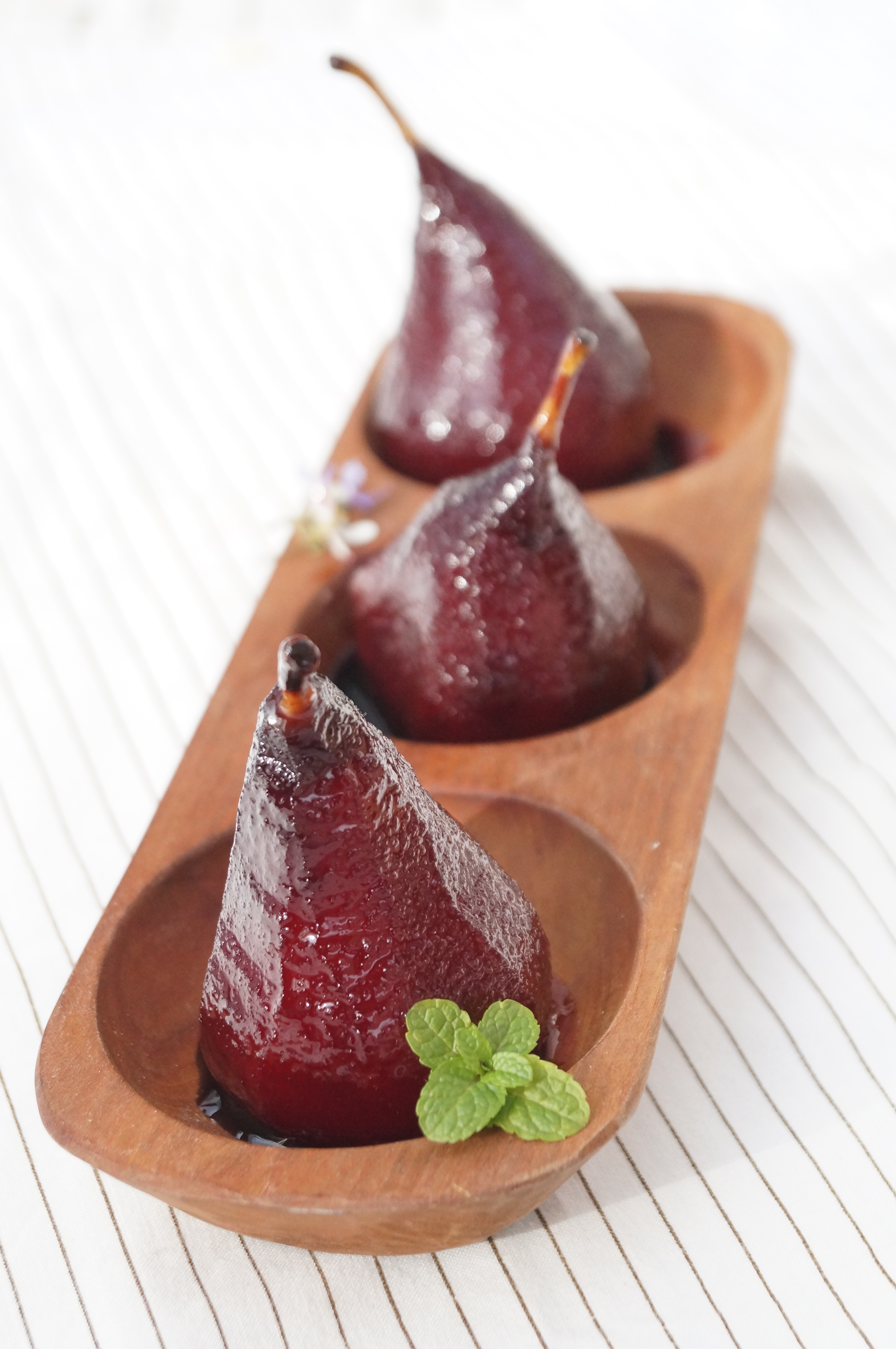 Seguir evaporando la salsa hasta que tengamos el punto de salsa y servir sobre las peras. Decorar con unas hojas de menta.