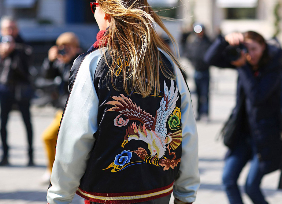 - Un aire femenino y más glamoroso. La bomber, con texturas de satín y bordados en la espalda, le quitan un poco de rudeza al modelo original.