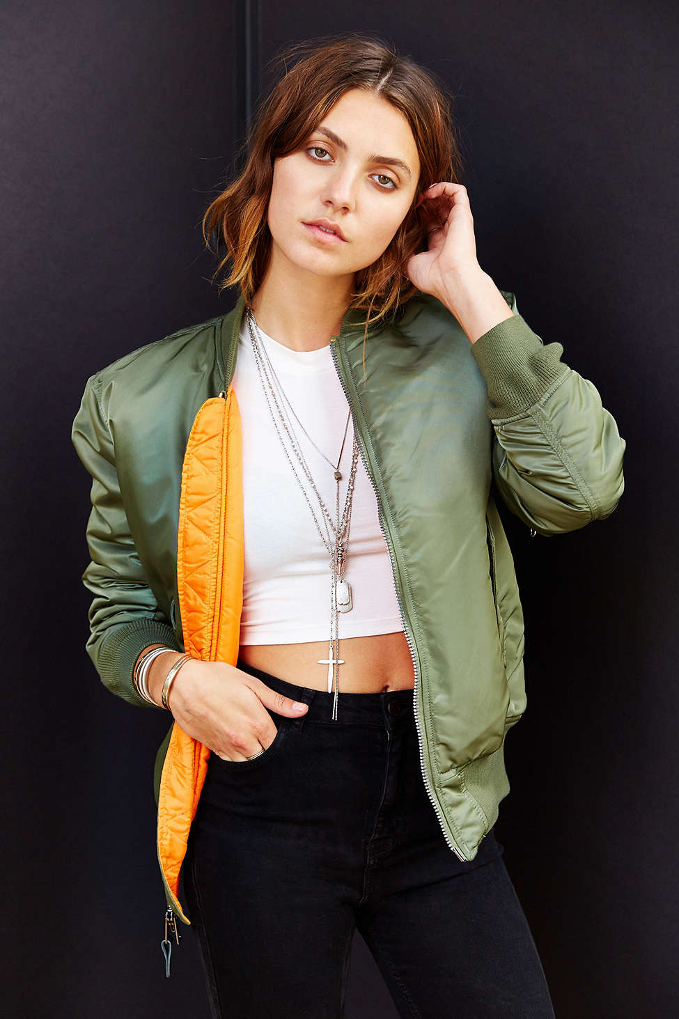 - El clásico puro de Aviarex, pero personalizado. La bomber jacket verde militar con forro interno naranja es la prenda de la temporada. Tanto así que ¡se encuentra agotada a nivel mundial! El guiño actual viene al personalizarla con parches eclécticos, mejor si son lúdicos.
