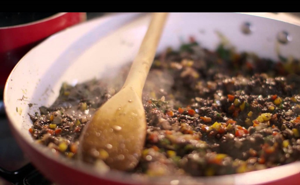 Mientras, en un sartén calentar un poco de aceite de oliva, agregar la cebolla picada en cubitos bien chicos y 1 diente de ajo. Añadir sal, pimienta y cocinar hasta que la cebolla este transparente y al probarla no suene crocante. Lo mejor para que no se queme es ir agregando un poco de agua caliente. Agregar 500 gramos de prietas desmenuzadas, comino, ají de color, sal y pimienta. Cocinar a fuego medio bajo por 7 minutos y reserva.