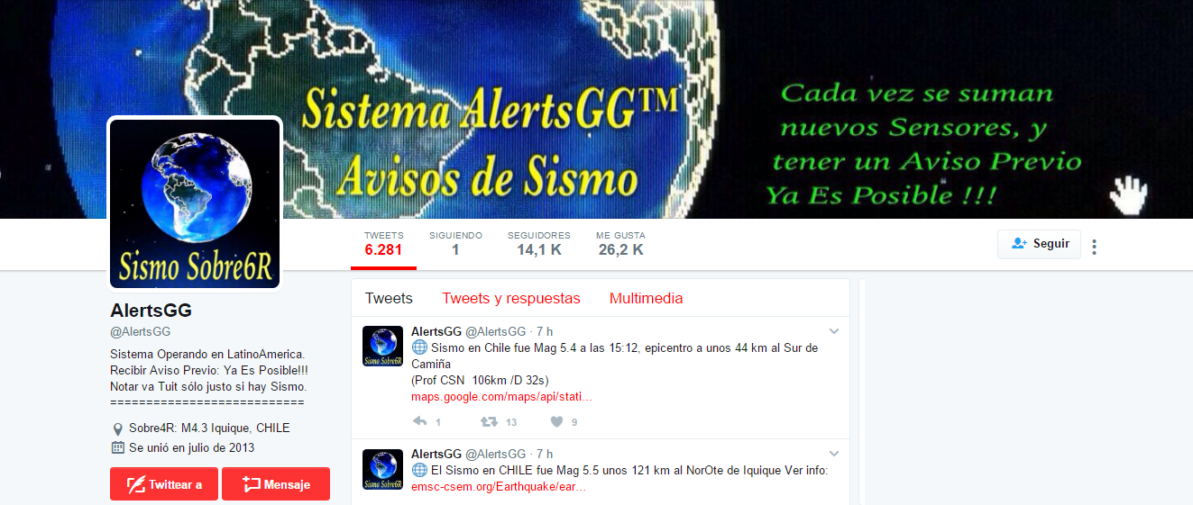 Si eres twittero, puedes suscribirte a las actualizaciones de la cuenta @AlertsGG. Te manda notificaciones durante los momentos previos al temblor. Este sistema también es potente y me ha funcionado en forma consistente desde el día del terremoto. Es fácil el proceso, solo debes seguir la cuenta y activar las notificaciones, dejando así la opción que te avise en cada tweet. Con esto queda demostrado que Twitter y la radio son los dos medios más rápidos para entregar información, dejando de lado las hipótesis de la posible extinción de la red del pajarito.